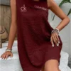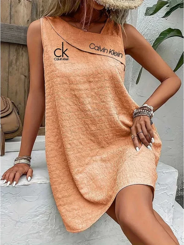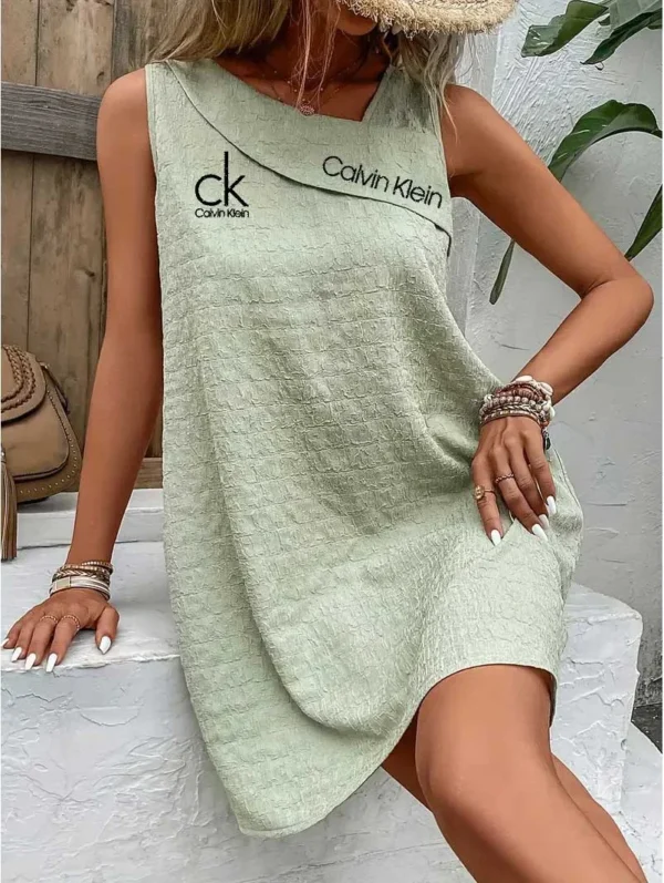 Emblazoned with the iconic Calvin Klein logo on the chest, this dress reflects timeless branding. Pair it with layered bracelets and a straw hat for a chic, laid-back ensemble. Minimalist yet bold, it speaks effortless luxury.