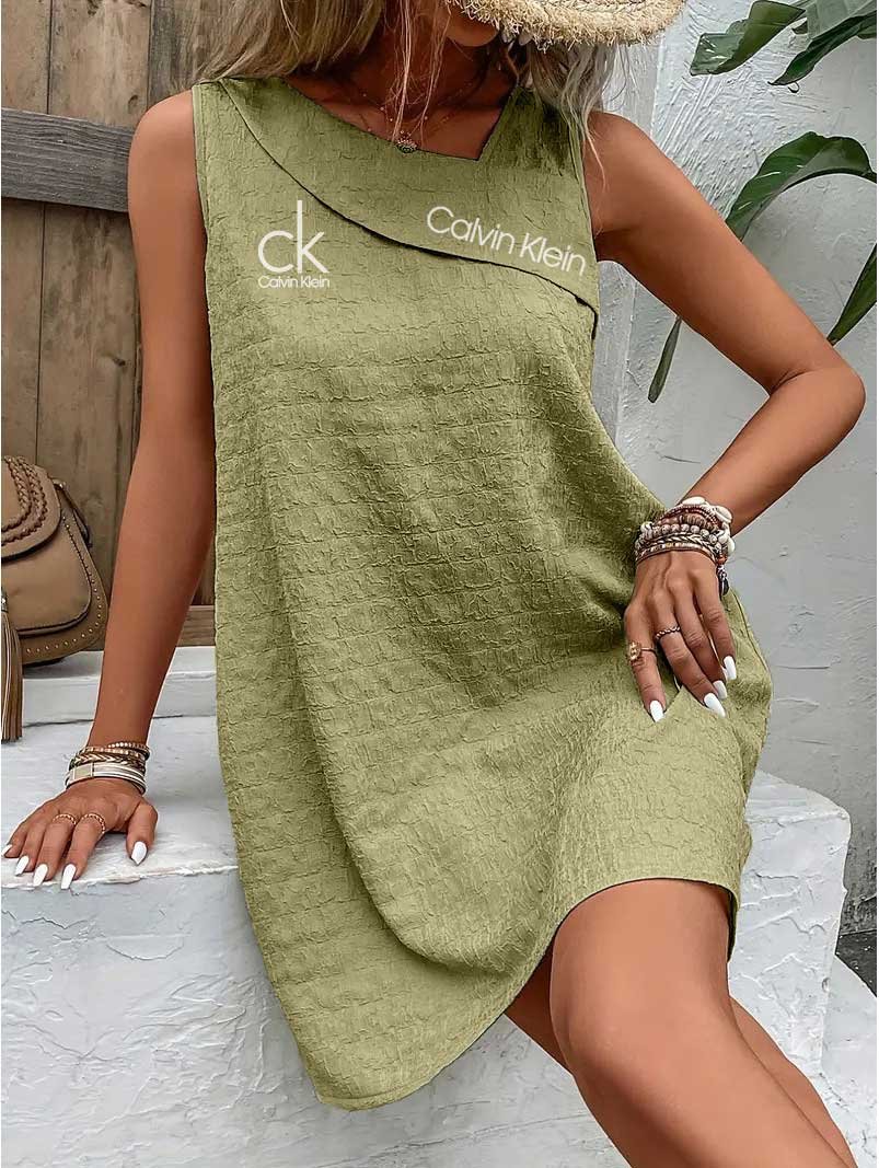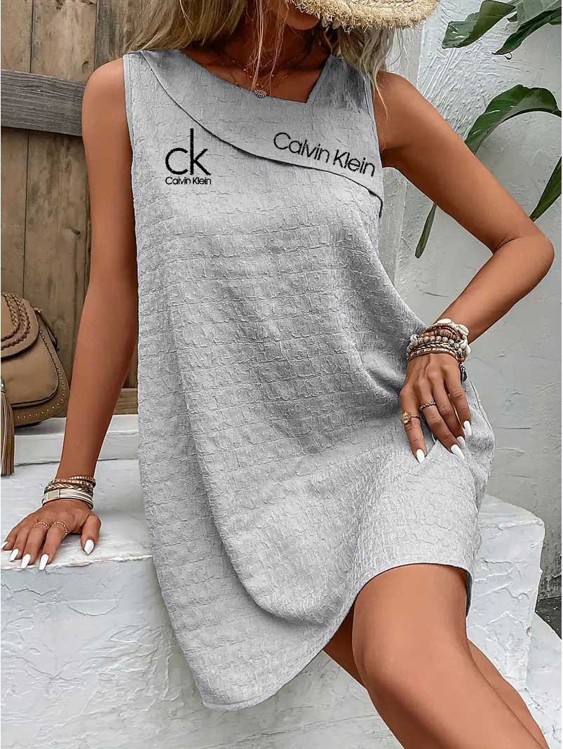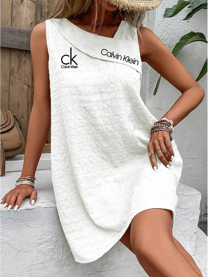 Emblazoned with the iconic Calvin Klein logo on the chest, this dress reflects timeless branding. Pair it with layered bracelets and a straw hat for a chic, laid-back ensemble. Minimalist yet bold, it speaks effortless luxury.